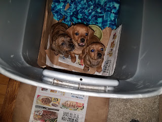 Aunt Karen and Lucia were going to be staying with us the following Friday (last night) as Lucia was running a race in Baltimore. So, Aunt Karen brought all 3 female pups with her to see if we'd like to have one join our family. While they were quite cute, we decided now just isn't the right time for a puppy. Despite how ecstatic Isaac appears in these pictures, he was very understanding when it came time for Aunt Karen to leave with the puppies. No tears or tantrums were had by anyone in the household.